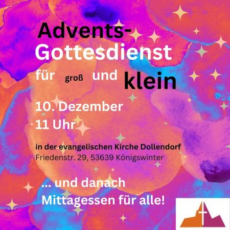 Am 2. Advent, den 10. Dezember 2023 findet ein Adventsgottesdienst im der Ev. Kirche Dollendorf statt. Pfarrerin Carina Pietscher wird diesen Familiengottesdienst für groß und klein halten. Im Anschluß gibt es ein Mittagessen für alle!