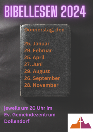 Hier sind die neuen Termine für das Jahr 2024 der Bibel-Lesegruppe. Das Treffen ist einmal im Monat donnerstags um 20 Uhr im evangelischen Gemeindezentrum Dollendorf.