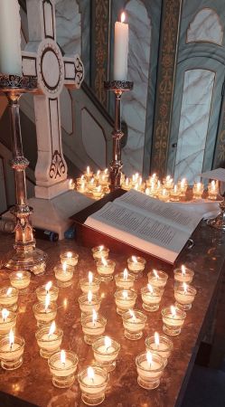 Im Gedenken wurden die 89 Namen der im zu Ende gehenden Kirchenjahr verstorbenen Gemeindeglieder vorgelesen. Für jeden wurde von Konfirmanden eine Kerze angezündet. Im Anschluss gruppierte man sich um dieses Kerzenmeer zum Abendmahl.