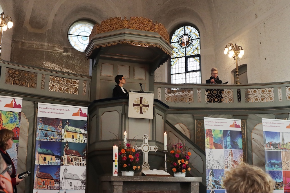 Die Gemeinde trägt übrigens zum Festakt lila und orange. Jedenfalls in Form von FFP2-Masken, den Farben aus dem Logo der fusionierten Gemeinde. An der Altarseite springen vier große Aufsteller mit Bildern der vier Kirchen (Alte Kirche Oberkassel, Große Kirche Oberkassel, Christuskirche Königswinter-Altstadt und die Evangelische Kirche Dollendorf) ins Auge. Jede auf ihre Art besonders und einladend.