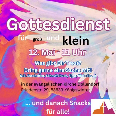 Herzliche Einladung zum Gottesdienst für groß und KLEIN, am 12. Mai, 11 Uhr in Dollendorf.