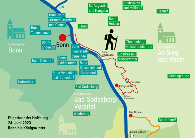 Startpunkt der Pilgertour der Hoffnung von Präses Dr. Thorsten Latzel ist die Bonner Kreuzkirche am Kaiserplatz. Gemeinsam geht es dort am Samstag, 24. Juni, um 8 Uhr mit einem geistlichen Impuls los. Zu Beginn der Tour steht das Pilgern selbst thematisch im Mittelpunkt: Warum pilgern? Wie evangelisch pilgern? Pfarrerin Simone Enthöfer, für den landeskirchlichen Arbeitsbereich Missionale Kirche zuständig, Pfarrer Christoph Nötzel aus der Christusgemeinde Brauweiler-Königsdorf und eine Pilgergruppe der Gemeinde Oberkassel-Königswinter sind auf Teilen des ersten Etappenabschnitts Gesprächspartner*innen und Wegbegleiter*innen von Präses Dr. Thorsten Latzel.