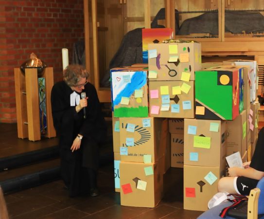 Der letzte Sonntag vor den Sommerferien ist immer etwas Besonderes: Es gibt den Reisesegen und im Anschluss an den Familiengottesdienst ein gemeinsames Mittagessen. Doch zuvor stellten sich die 26 neuen Konfirmandinnen und Konfirmanden vor, u.a. mit selbst bemalten Papp-Hockern. Damit wurde ein Haus gebaut, auf das alle Anwesende ihren Namen und ihre Wünsche kleben konnten. Dass das (Pappkarton-) Haus lebendig wird, kommt von der Vielfalt der Menschen – mit Jesus als Eckstein und mit Gott, der in jedem einzelnen von uns ist.