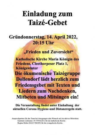 Die ökumenische Taizégruppe Dollendorf lädt herzlich zum Friedensgebet mit Texten und Liedern zum Nachdenken, Mitbeten und Mitsingen ein!