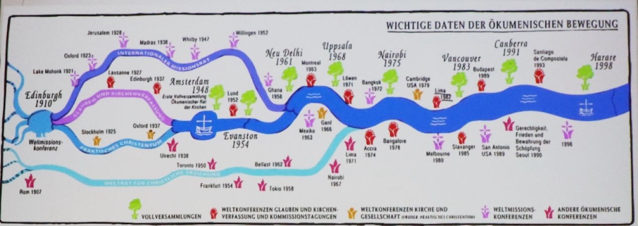 Die ökumenische Bewegung sieht sich als Fluss und hatte ihre Vorläufer in der Weltmissionskonferenz 1910 in Edinburgh. Das eigentliche Gründungsdatum ist 1948 mit der 1. Vollversammlung in Amsterdam. Viele immer noch wichtige Themen werden auf den Vollversammlungen diskutiert und in den Mitgliedskirchen weiterverfolgt: