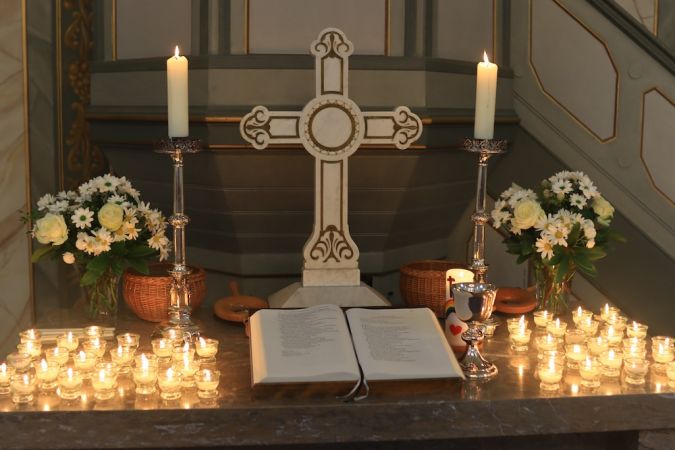 Im Anschluss wurden die 72 Namen der im zu Ende gehenden Kirchenjahr verstorbenen Gemeindemitglieder vorgelesen. Für jeden wurde von Konfirmanden eine Kerze entzündet. Darum gruppierte man sich im Anschluss für das Abendmahl.