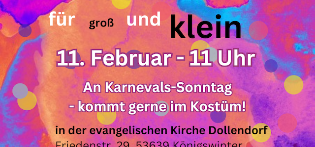 Wir feiern wieder mit groß und KLEIN gemeinsam Familiengottesdienst - diesmal an Karnevalssonntag, 11. Februar, um 11 Uhr in Dollendorf!