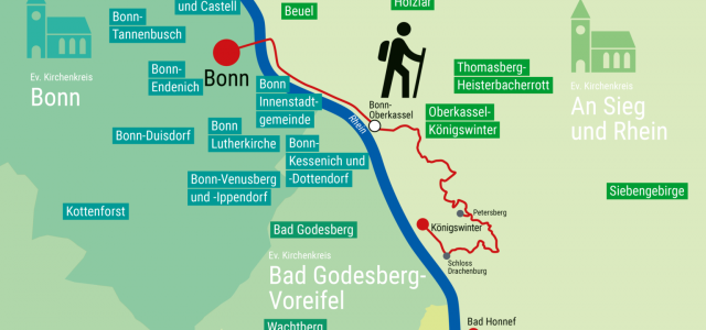 Gemeinsam gehen, reden, beten: Vom 24. Juni bis 1. Juli 2023 lädt Präses Dr. Thorsten Latzel zu einer Pilgertour der Hoffnung ein. 197 Kilometer, von Bonn nach Bingerbrück, auf dem Rheinsteig und dem Rheinburge…