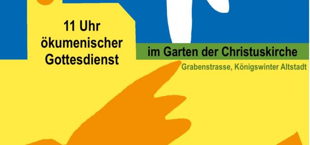 Um 11 Uhr am Pfingstmontag feiern wir Gottesdienst mit unseren evangelischen und katholischen Nachbargemeinden im Garten der Christuskirche (Grabenstraße, Altstadt Königswinter).