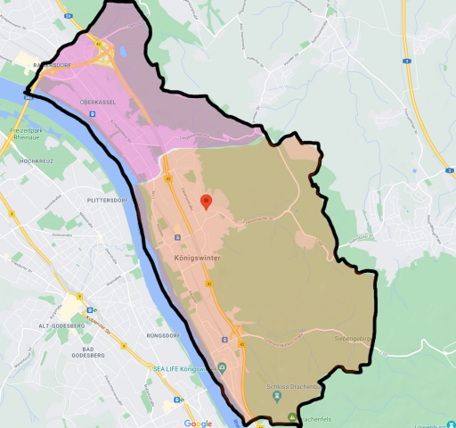 Unsere beiden Pfarrerinnen haben sich dieses große Gebiet aufgeteilt. Pfarrerin Sophia Döllscher ist für Oberkassel (lila eingefärbt) und Pfarrerin Anne Kathrin Quaas ist für Dollendorf und Königswinter-Altstadt zuständig (orange eingefärbt). Natürlich vertreten sie sich gegenseitig. Es gibt neben der regionalen Zuständigkeit auch eine Arbeitsteilung von Aufgabengebieten (z.B. der Konfirmanden-Arbeit).