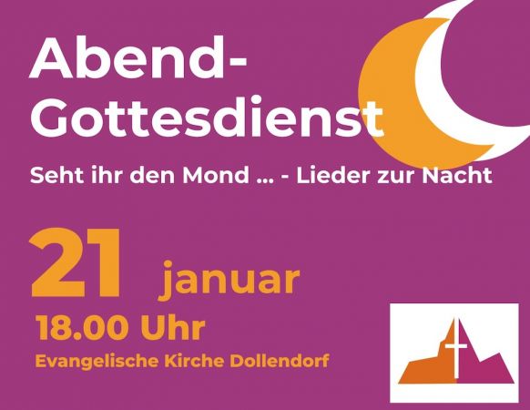 Am Sonntag, den 21. Januar feiern wir um 18 Uhr Gottesdienst in der Evangelischen Kirche Dollendorf. Wir singen und beten miteinander und schöpfen aus dem reichen Schatz unserer christlichen Abendlieder.