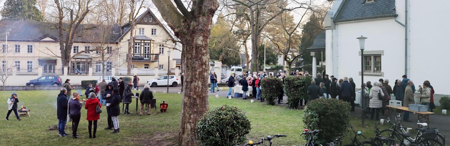 Die Gemeinde trägt übrigens zum Festakt lila und orange. Jedenfalls in Form von FFP2-Masken, den Farben aus dem Logo der fusionierten Gemeinde. An der Altarseite springen vier große Aufsteller mit Bildern der vier Kirchen (Alte Kirche Oberkassel, Große Kirche Oberkassel, Christuskirche Königswinter-Altstadt und die Evangelische Kirche Dollendorf) ins Auge. Jede auf ihre Art besonders und einladend.