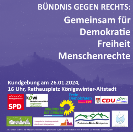 Als Evangelische Kirchengemeinde Oberkassel-Königswinter rufen wir zur Teilnahme an der Kundgebung „Gemeinsam für Demokratie, Freiheit und Menschenrechte “ am 26. Januar um 16 Uhr auf dem Rathausplatz in der Königswinterer Altstadt auf.