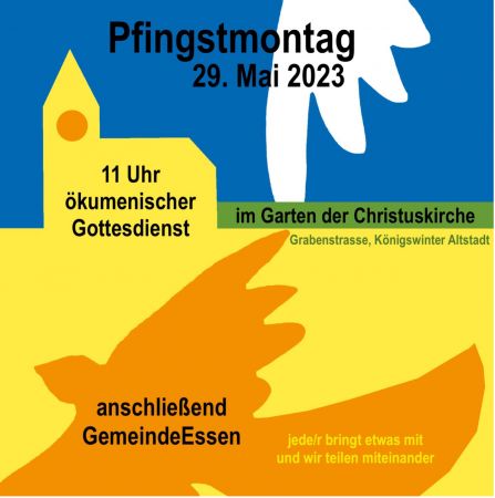 Um 11 Uhr am Pfingstmontag feiern wir Gottesdienst mit unseren evangelischen und katholischen Nachbargemeinden im Garten der Christuskirche (Grabenstraße, Altstadt Königswinter).