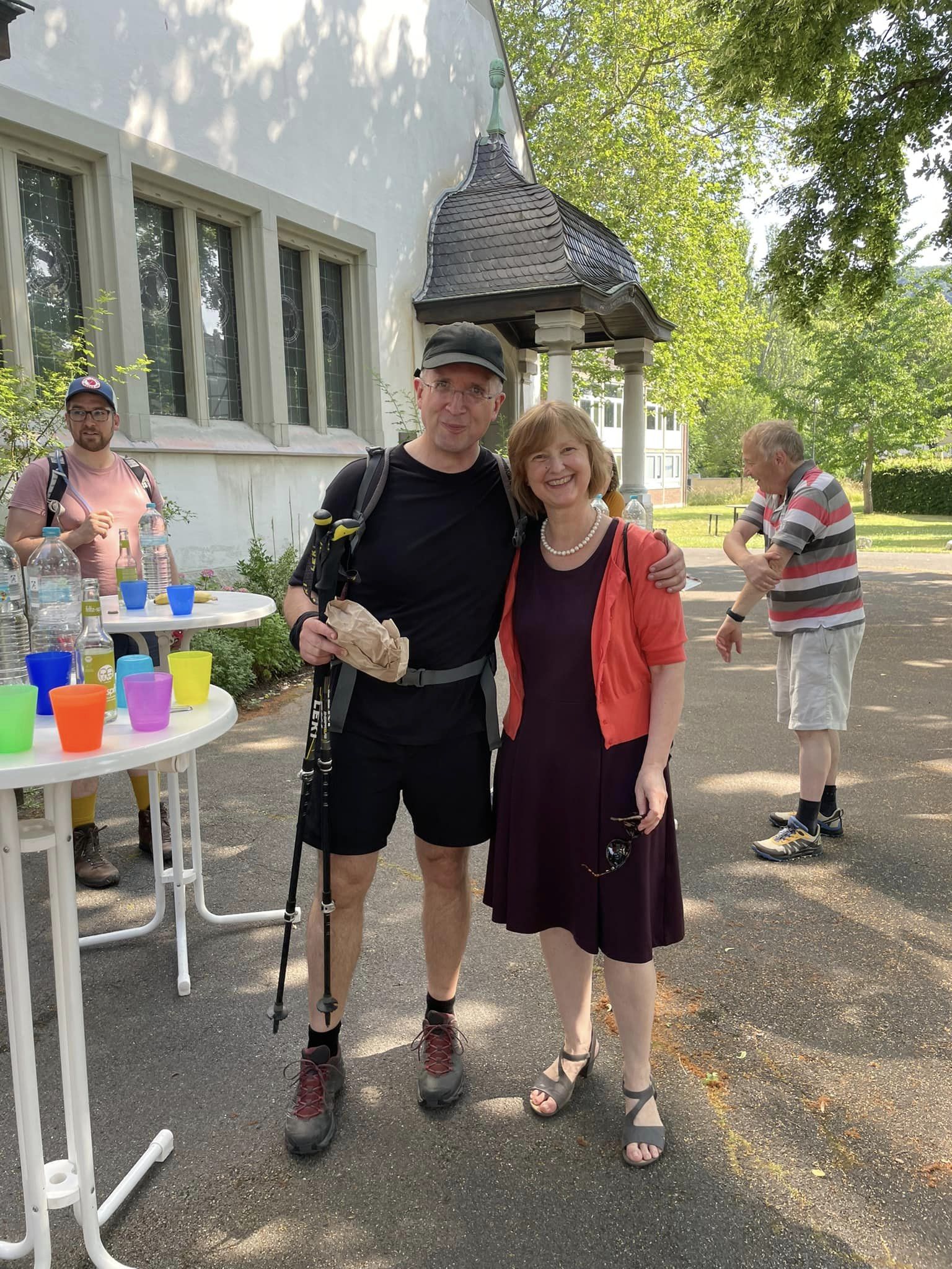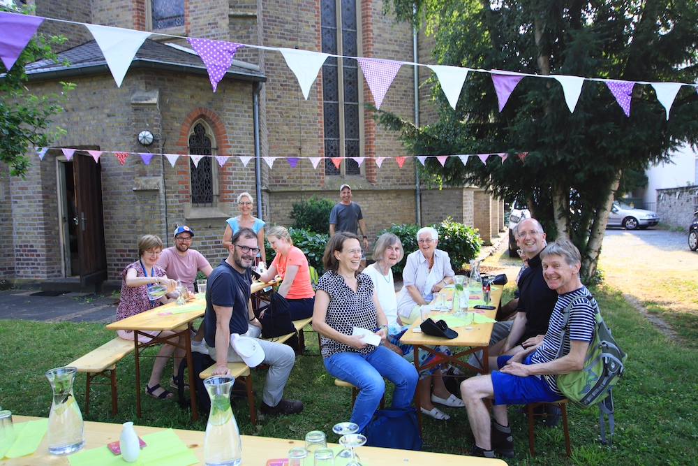 Gleich am ersten Tag kam er auch zu uns ins Siebengebirge. In der Großen Kirche traf er zufällig auf den Landesjugendposaunenchor, der sich unter der Leitung von Jörg Häusler für eine CD-Aufnahme getroffen hatte. Über den Petersberg kam die Pilgergruppe abends an der Christuskirche in der Königswinterer Altstadt an. Nach der von Superintendentin van Niekerk geleiteten Abendandacht ging der Tag mit leckerem irakischem Essen im Kirchgarten zu Ende.