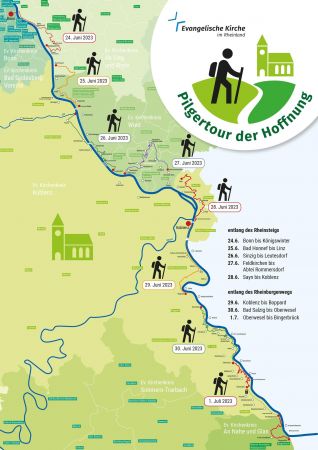 Acht Tage wanderte und pilgerte der Präses der Evangelischen Kirche im Rheinland, Thorsten Latzel, von Bonn nach Bingerbrück – entlang des Rheinsteigs und des Rheinburgenwegs. Ziel war es, mit Vertreterinnen und Vertretern der Gemeinden sowie mit zahlreichen Bürgerinnen und Bürgern ins Gespräch zu kommen.