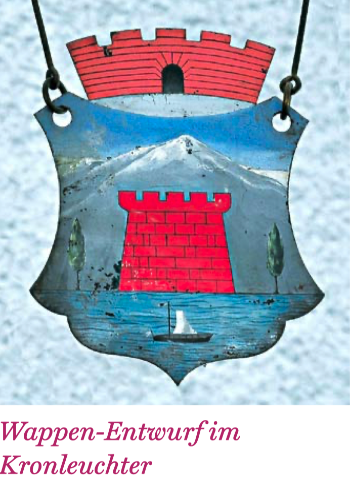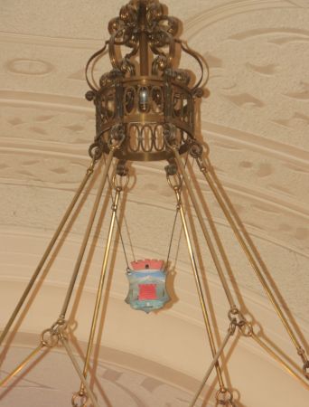 Schon Pfarrer Fromme bezeichnete in seiner Festschrift von 1908 den großen bronzenen Kronleuchter als prächtige Zierde für den Kirchenraum. Ein Detail dieses Leuchters ist das über dem Kranz hängende wappenähnliche Schild. Was hat es damit auf sich?