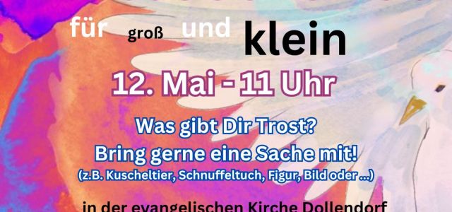 Herzliche Einladung zum Gottesdienst für groß und KLEIN, am 12. Mai, 11 Uhr in Dollendorf. Bring gerne einen Gegenstand mit zum Gottesdienst. Eine Sache, die Dich tröstet oder dir zumindest gut tut, wenn du traurig bist.