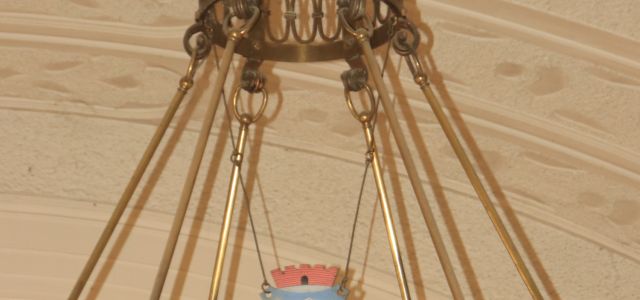 Schon Pfarrer Fromme bezeichnete in seiner Festschrift von 1908 den großen bronzenen Kronleuchter als prächtige Zierde für den Kirchenraum. Ein Detail dieses Leuchters ist das über dem Kranz hängende…
