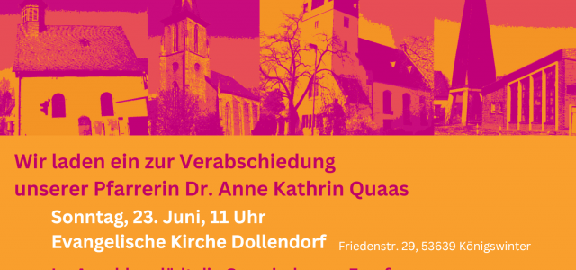 Am kommenden Sonntag den 23. Juni 2024 verabschieden wir Pfarrerin Dr. Anne Kathrin Quaas. 13 Jahre lang hat sie voller Engagement unsere Gemeinde mitgestaltet. Ab Juli übernimmt sie eine neue Aufgabe und eine neue Stelle in Bonn. Für uns bedeutet d…