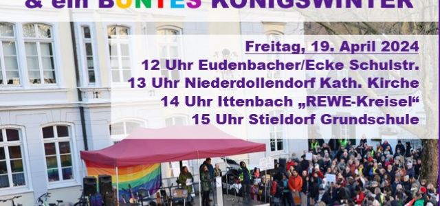 Die christlichen Gemeinden in Königswinter bitten um Beteiligung! Da die AfD für morgen, Freitag, den 19.04.2024, wieder zu Klein-Kundgebungen an verschiedenen Orten im Stadtgebiet von Königswinter aufgerufen hat, rufen wir gemeinsam mit den demokra…