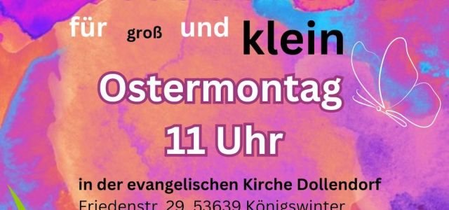 Ostermontag feiern wir Familiengottesdienst - um 11 Uhr in Dollendorf. Wir feiern gemeinsam mit groß und KLEIN und zusammen mit dem Kinderchor, den Minis! Nach dem Gottesdienst geht es mit allen, die möchten, auf die Suche... wo haben sich die Eier…