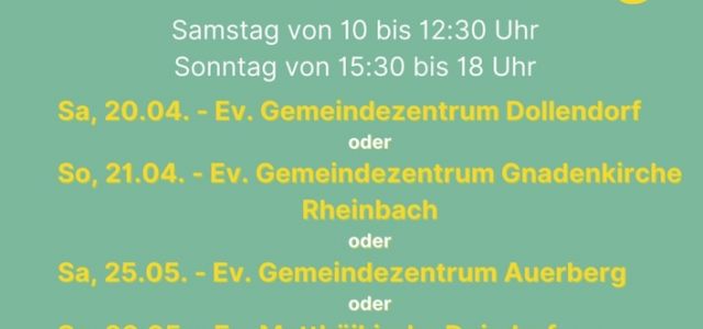 Zur Vorbereitung auf das Tauffest am 29. Juli in den Bonner Rheinauen werden auch Workshops angeboten. Der erste Workshop findet am Samstag, den 20. April im Gemeindezentrum Dollendorf statt. Wir treffen uns am Samstag, den 20.4. von 10.00 bis 12.3…