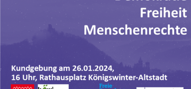 Als Evangelische Kirchengemeinde Oberkassel-Königswinter rufen wir zur Teilnahme an der Kundgebung „Gemeinsam für Demokratie, Freiheit und Menschenrechte “ am 26. Januar um 16 Uhr auf dem Rathausplatz in der Königswinterer Altstadt auf.