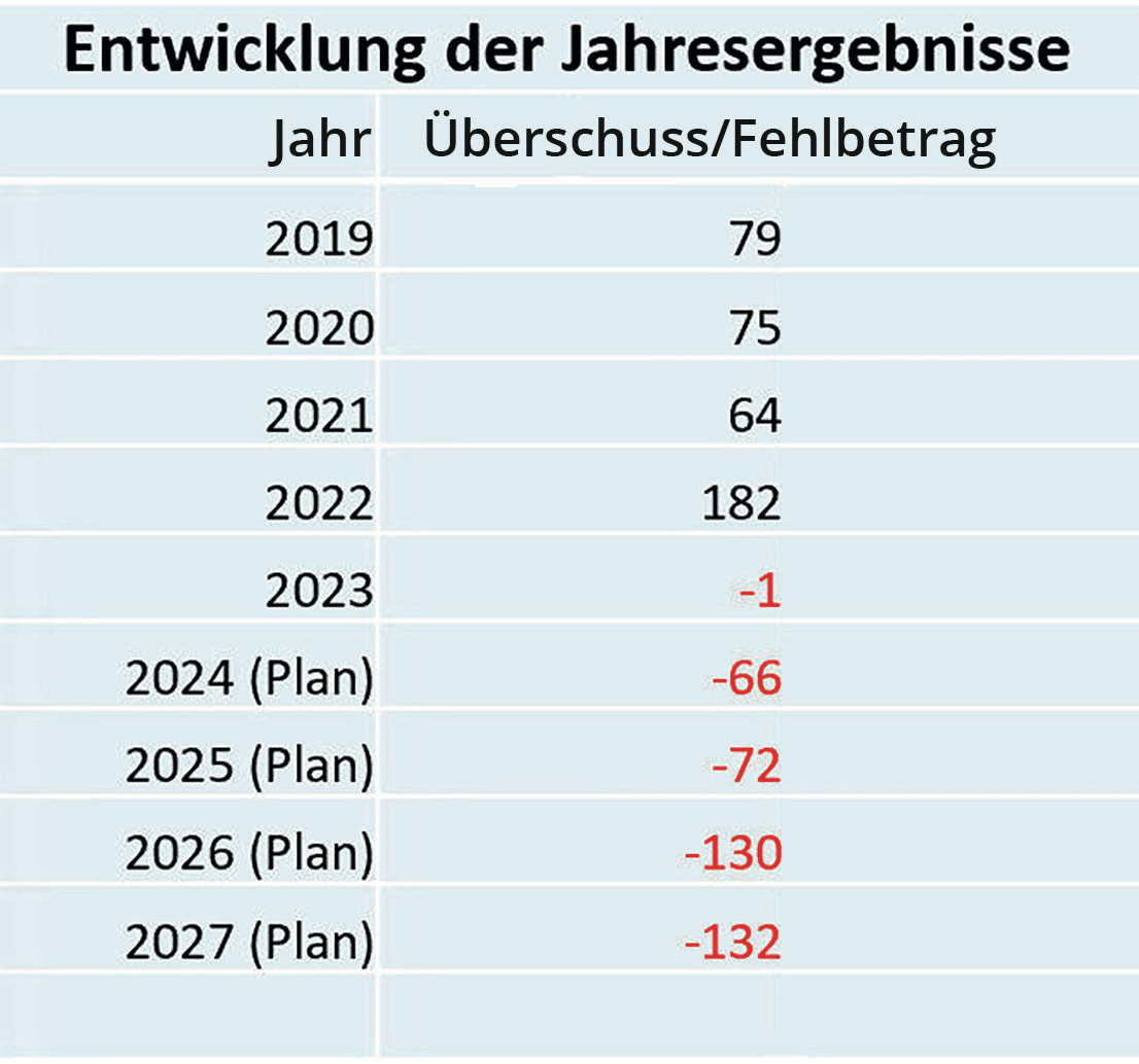 Zusammenfassung: Die notwendige Instandhaltungsaufwendungen belasten den laufenden Haushalt. Noch (!) können wir uns dies wegen unserer guten Vermögenssituation leisten. Aber die Rücklagen sind endlich. Die Ausgabenseite wird allein durch Inflation und Personalkostensteigerungen wachsen und steht einer mittelfristig sogar sinkenden Einnahmeseite gegenüber. Immer höhere Defizite wären die Folge.