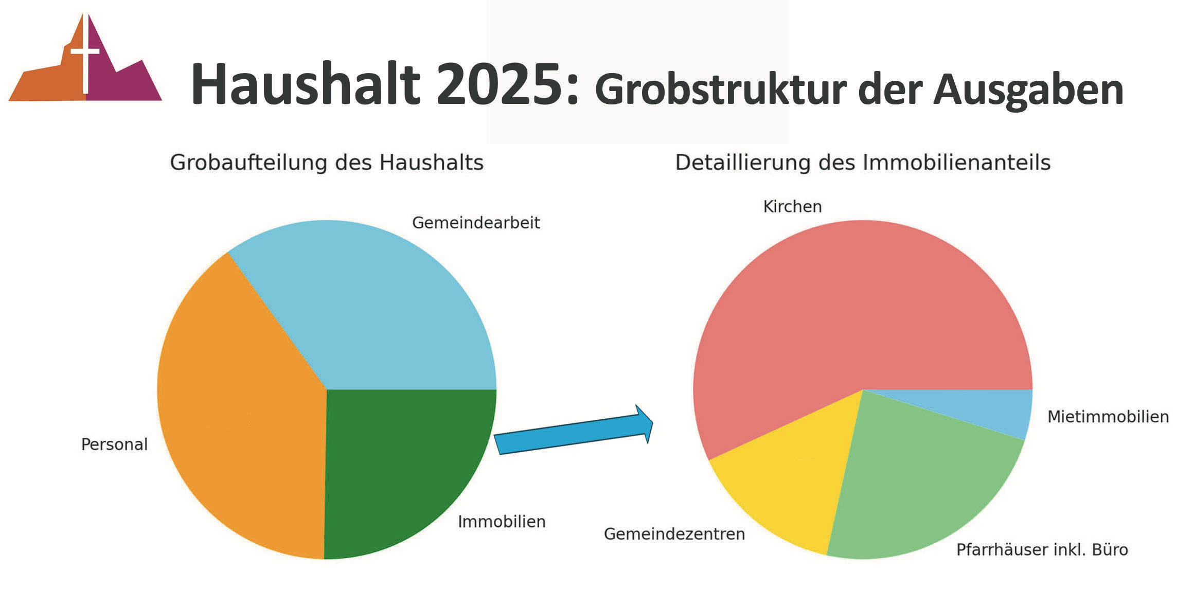 Ausgaben: „Kirche“ ist personalintensiv und der Dienst am Menschen sollte es auch sein. 40 % der Ausgaben werden für das Pfarrpersonal und die Küster/ Gemeindesekretärinnen etc. ausgegeben. Gut ein Drittel der Ausgaben kann der Gemeindearbeit zugeordnet werden (für Gottesdienste, Kirchenmusik, Kinder-/ Jugendarbeit und Verwaltung). Ein Viertel unserer Ausgaben entfällt gegenwärtig auf die Instandsetzung der Immobilien, insbesondere der meist alten und denkmalgeschützten Kirchen und Gemeindehäuser.
