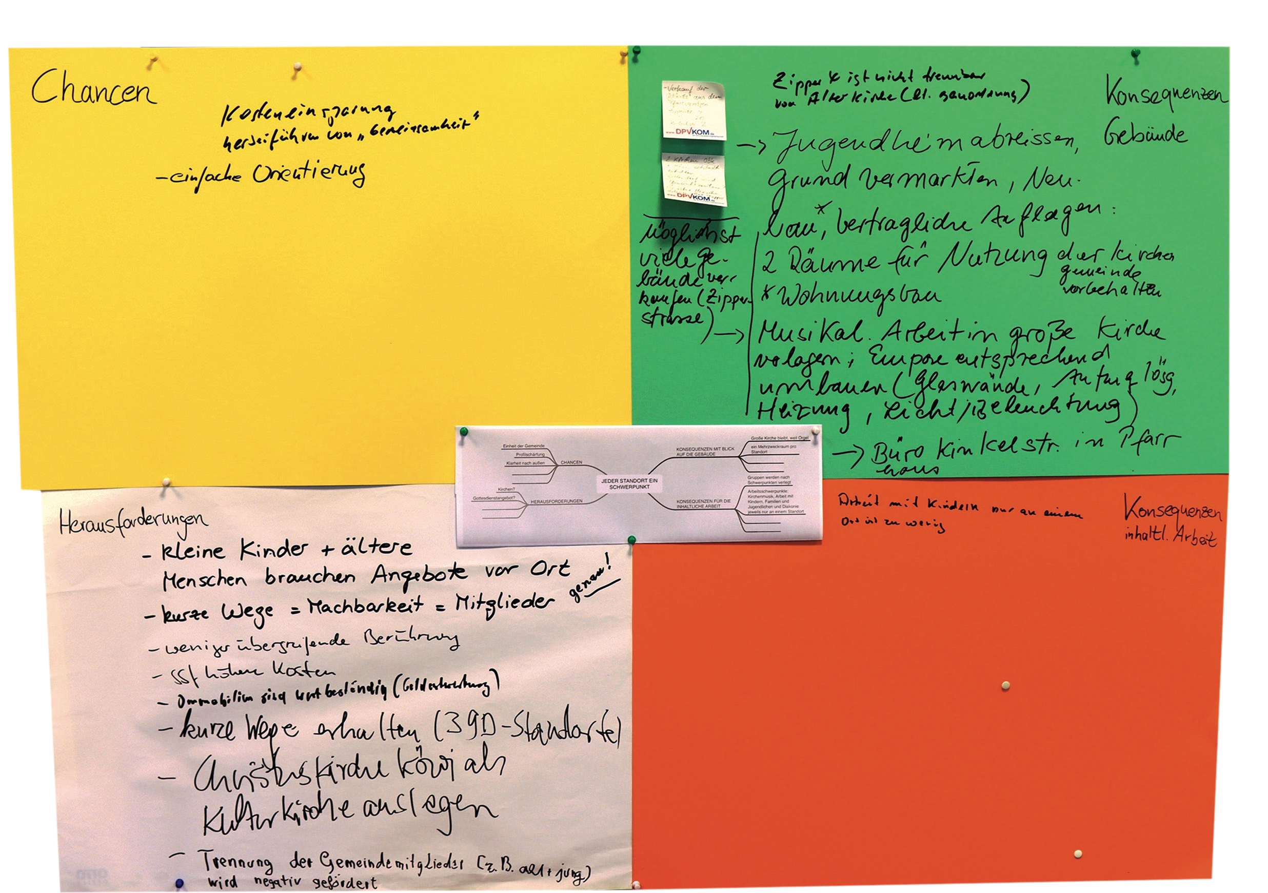Hilfreich ist außerdem, dass wir als Gemeinde das Denken in Optionen bereits geübt haben: Auf der Gemeindeversammlung im November 2022 haben wir Argumente zu Optionen ausgetauscht. Es wurde überlegt, was es für Chancen aber auch für Herausforderungen mit sich bringt, wenn es z. B. nur noch 1 Standort mit Kirche und Gemeindehaus in der Gemeinde gibt, oder 3 Standorte mit 3 Schwerpunkten oder 3 historische Kirchen und 1 Gemeindehaus.