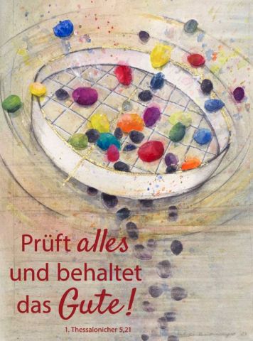 Diesen Satz richtet der Apostel Paulus an die Gemeinde in Thessaloniki, eine zu der damaligen Zeit multikulturelle und multireligiöse Handelsstadt. Paulus liegt die von ihm gegründete junge Gemeinde am Herzen und er möchte ihre christliche Identität stärken. Er ermahnt sie, sich selbstkritisch zu hinterfragen und an dem Guten festzuhalten: