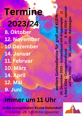 An jedem zweiten Sonntag im Monat feiern wir um 11:00 Uhr in Dollendorf unsere Gottesdienste für groß und KLEIN. In diesen Gottesdiensten sind Kinder und ihre Eltern ganz besonders willkommen. als Gemeinde, freuen wir uns, wenn unsere Jüngsten einen guten Platz in unserem Gemeindeleben finden. Im Anschluss an den Gottesdienst gibt es immer ein gemeinsames Mittagessen.